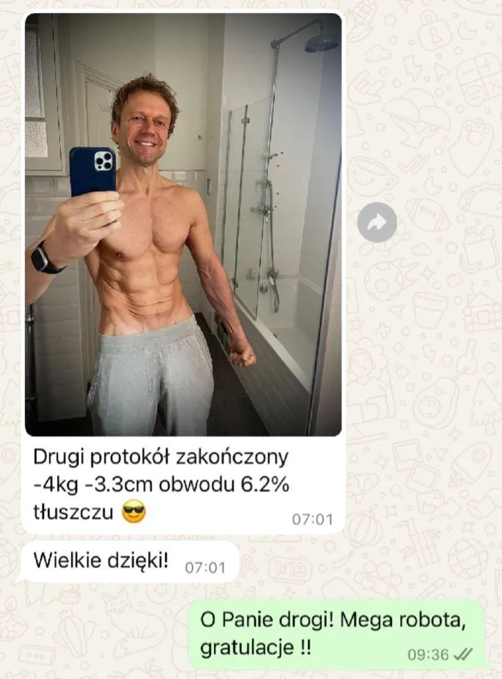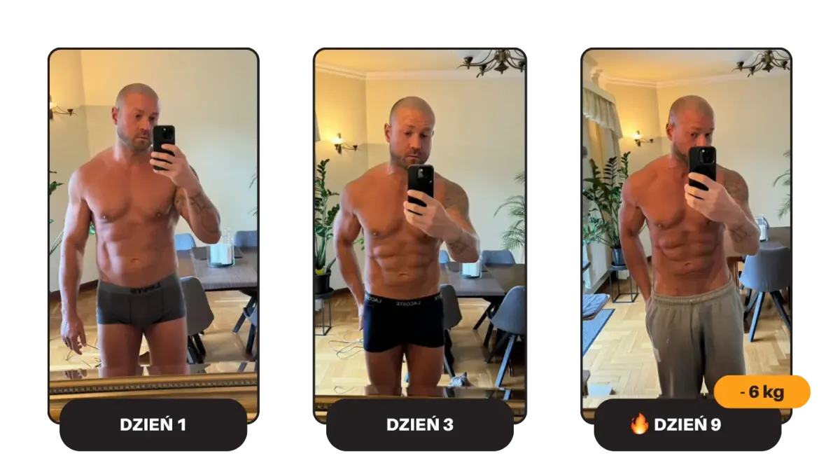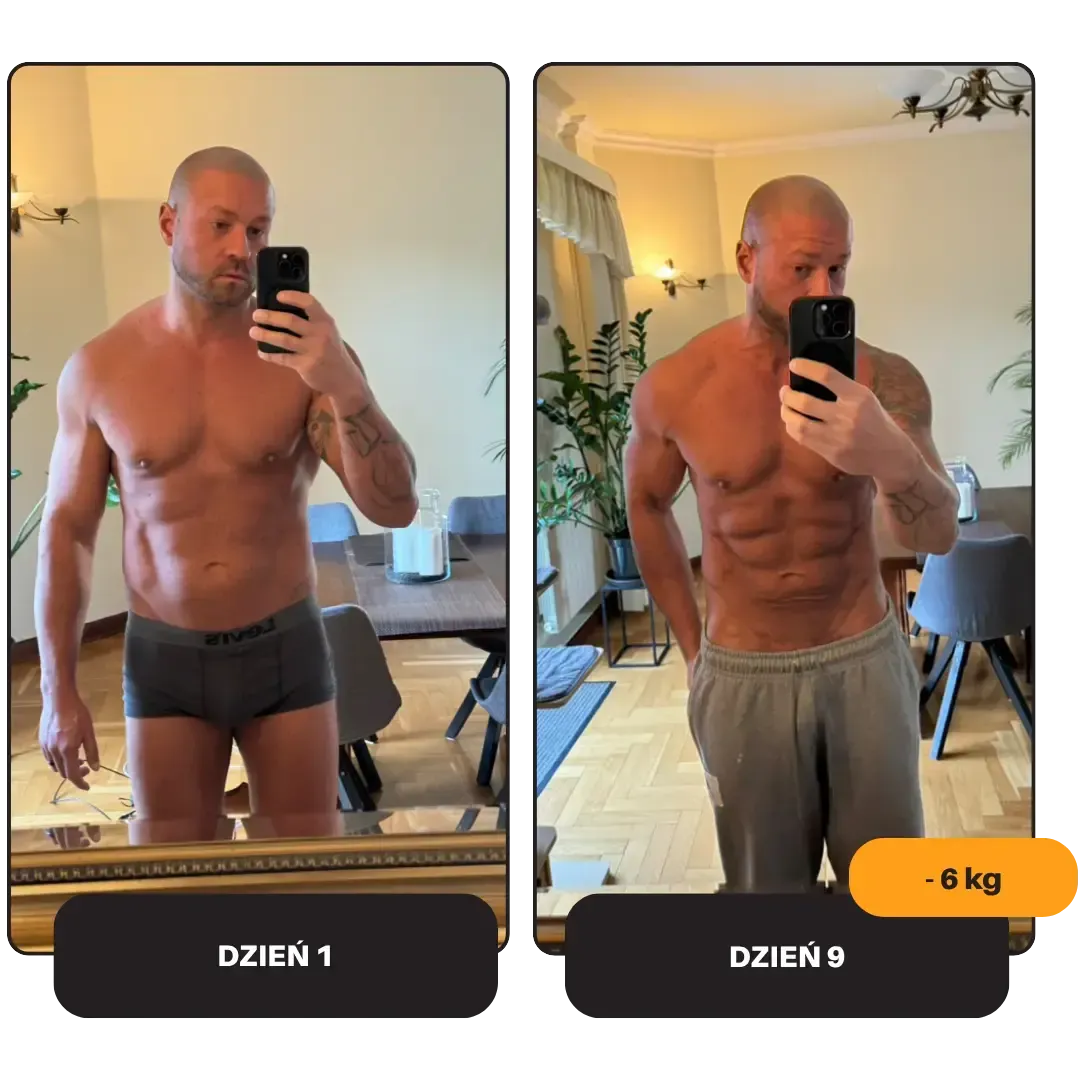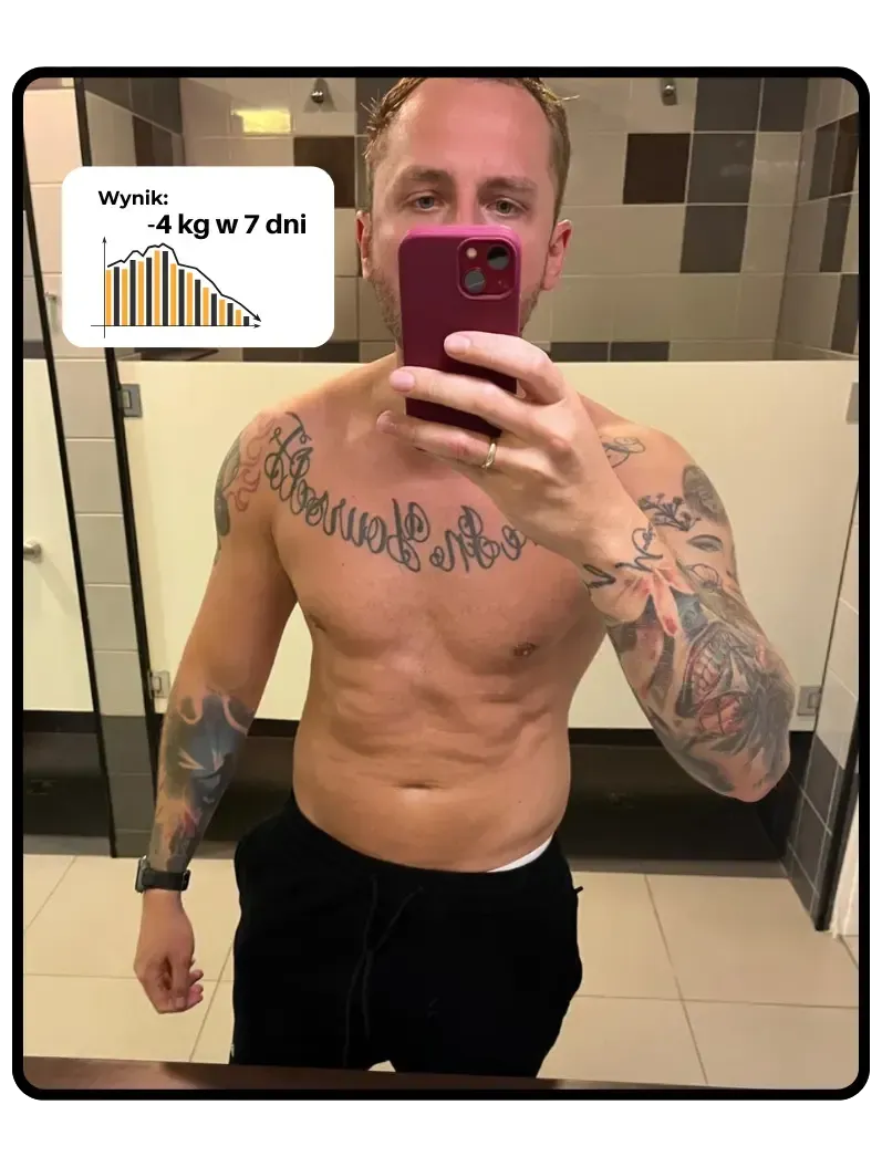 W tydzień zrzuciłem 4 kg, zniknęła część oponki, a ciało zaczęło wyglądać zupełnie inaczej. Kluczowe było dobre planowanie posiłków i rezygnacja z jedzenia “na mieście”, co początkowo było trudne, ale szybko weszło w nawyk. Teraz czuję się dobrze, mam więcej pewności siebie i chcę żyć dalej zgodnie z tymi zasadami. Polecam każdemu, kto potrzebuje szybkiego efektu, który da kopa do dalszych zmian."