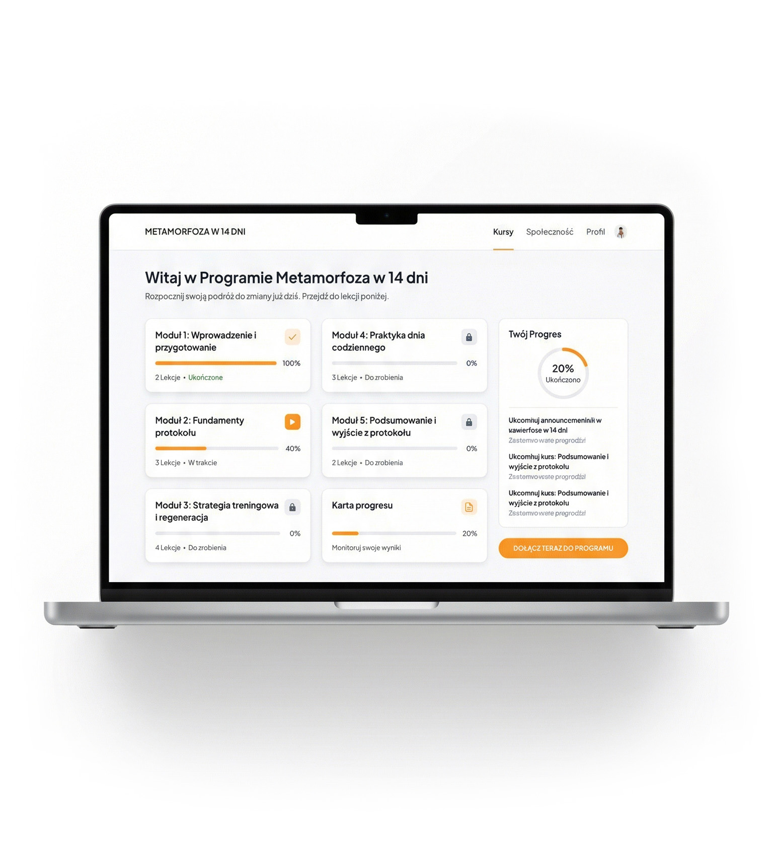 Odrazu po dołączeniu dostajesz dostęp do 5 modułów wideo oraz dodatkowych materiałow, które dokładnie tłumaczą cały protokół.